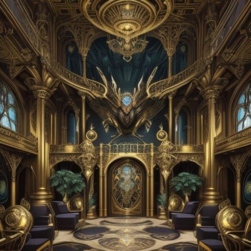 This digital painting depicts an opulent Art Nouveau ballroom within a giant mechanical owl, featuring gilded details, organic motifs, and hidden passages. Elegant fantasy architecture with soft lighting.