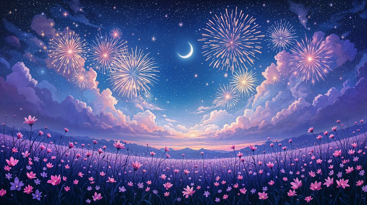This image shows a serene field of wildflowers and tall grasses under a starry night sky, with a spectacular fireworks display in vibrant pastel hues, a crescent moon, and fluffy textured clouds.