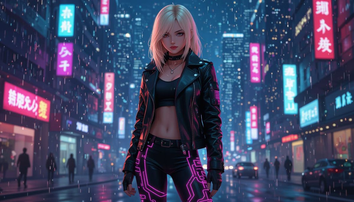 This image shows a blonde anime girl in a futuristic cyberpunk city. The 3D rendering features neon lights, intricate details, and a sleek black leather jacket in a cyberpunk aesthetic.