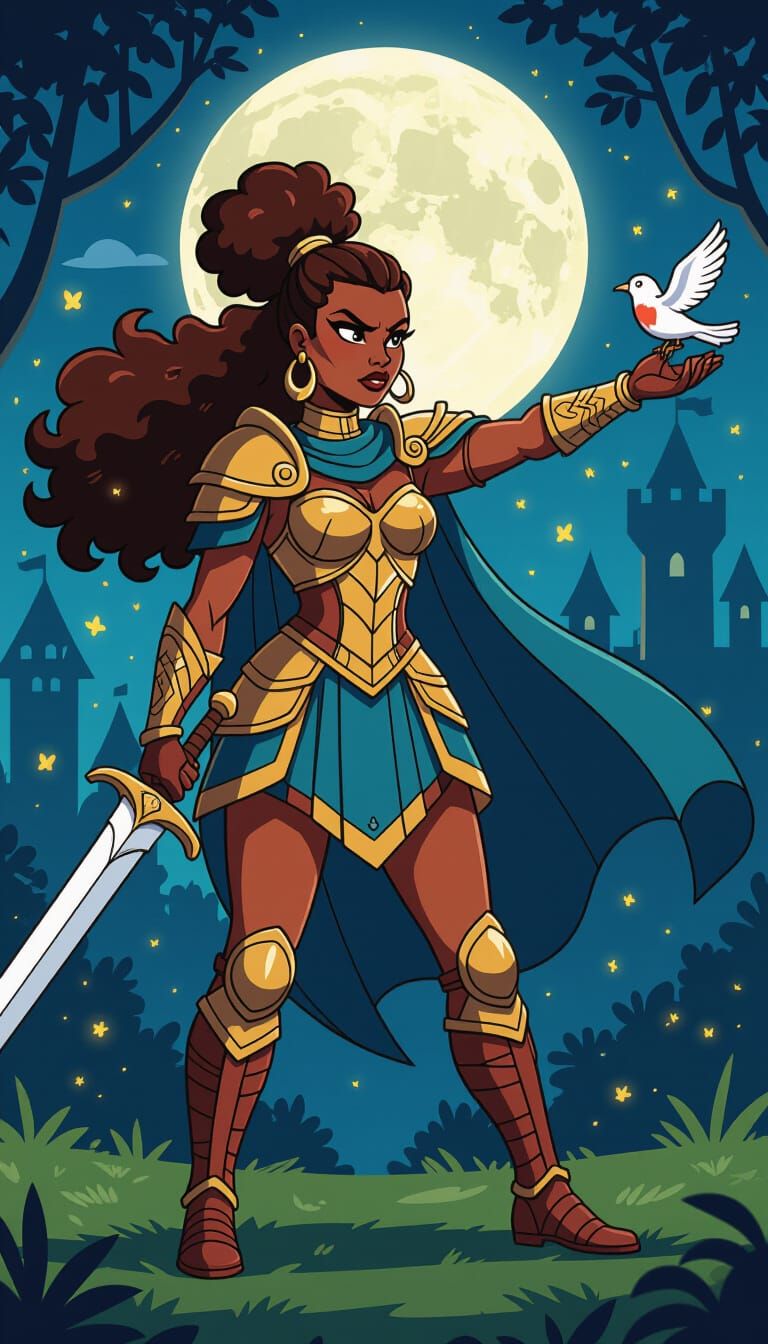 This image shows a Black woman warrior with an afro ponytail in colorful leather armor, standing in a forest at night. Moonlight illuminates the scene as a bird lands on her outstretched hand, in a retro 80's cartoon style.