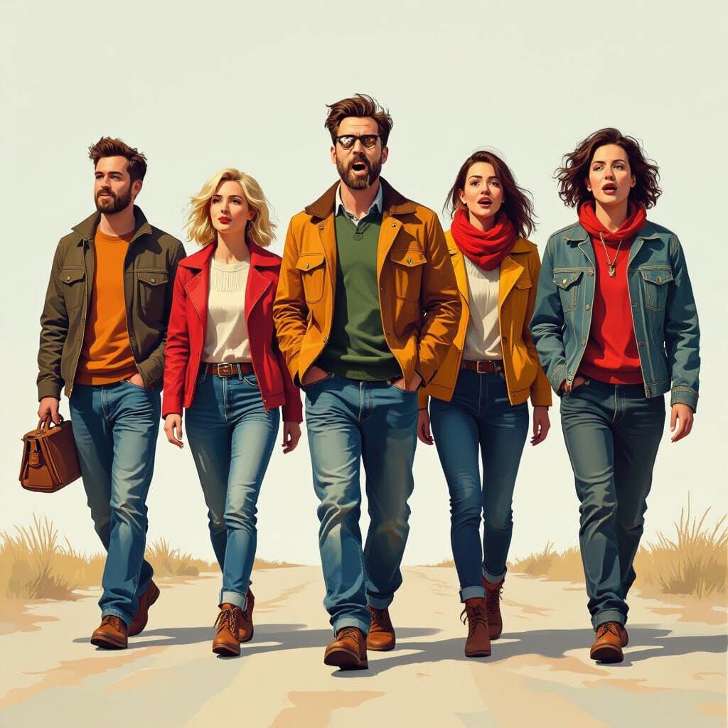 This image depicts a humorous scene where one person comically puts their foot in their mouth while seven others walk ahead. It features exaggerated expressions and vibrant, whimsical colors.
