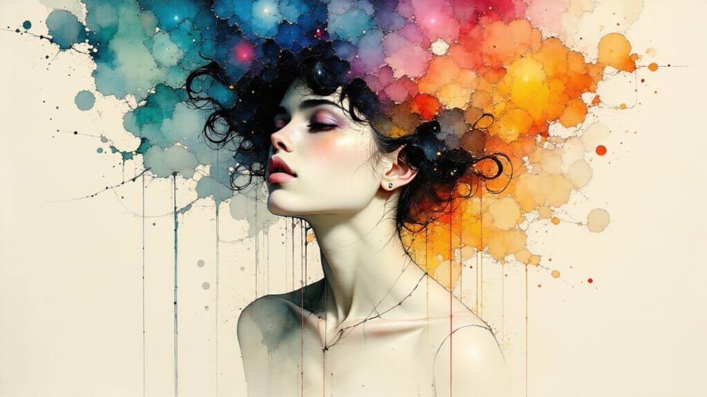 This image shows a delicate woman surrounded by swirling clouds and stardust, her form dissolving into soft watercolor hues, evoking a sense of wonder and magic in a dreamlike, surrealist atmosphere.