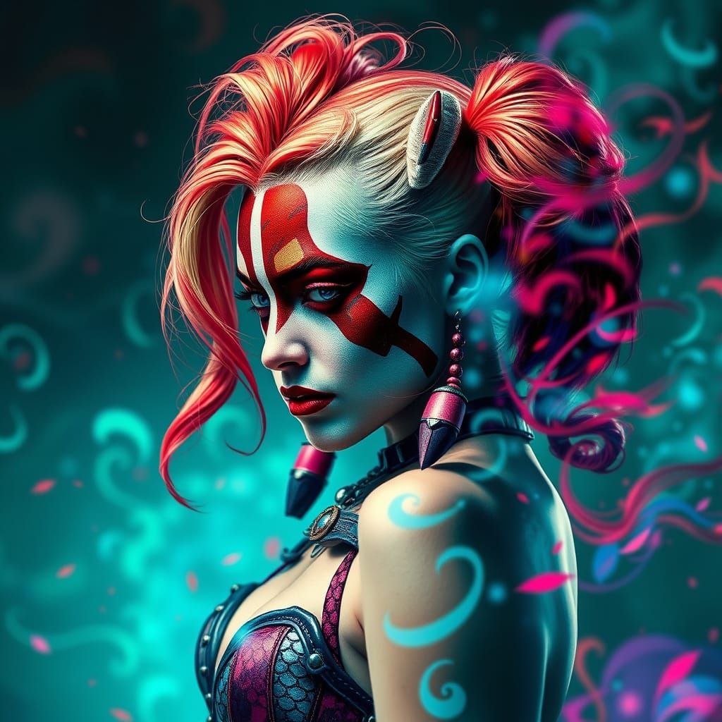 A vibrant image of a lion-striped mermaid warrior inspired by Harley Quinn. The artwork features a double exposure photography style blended with painterly elements, creating a hyperrealistic and intricately detailed composition.