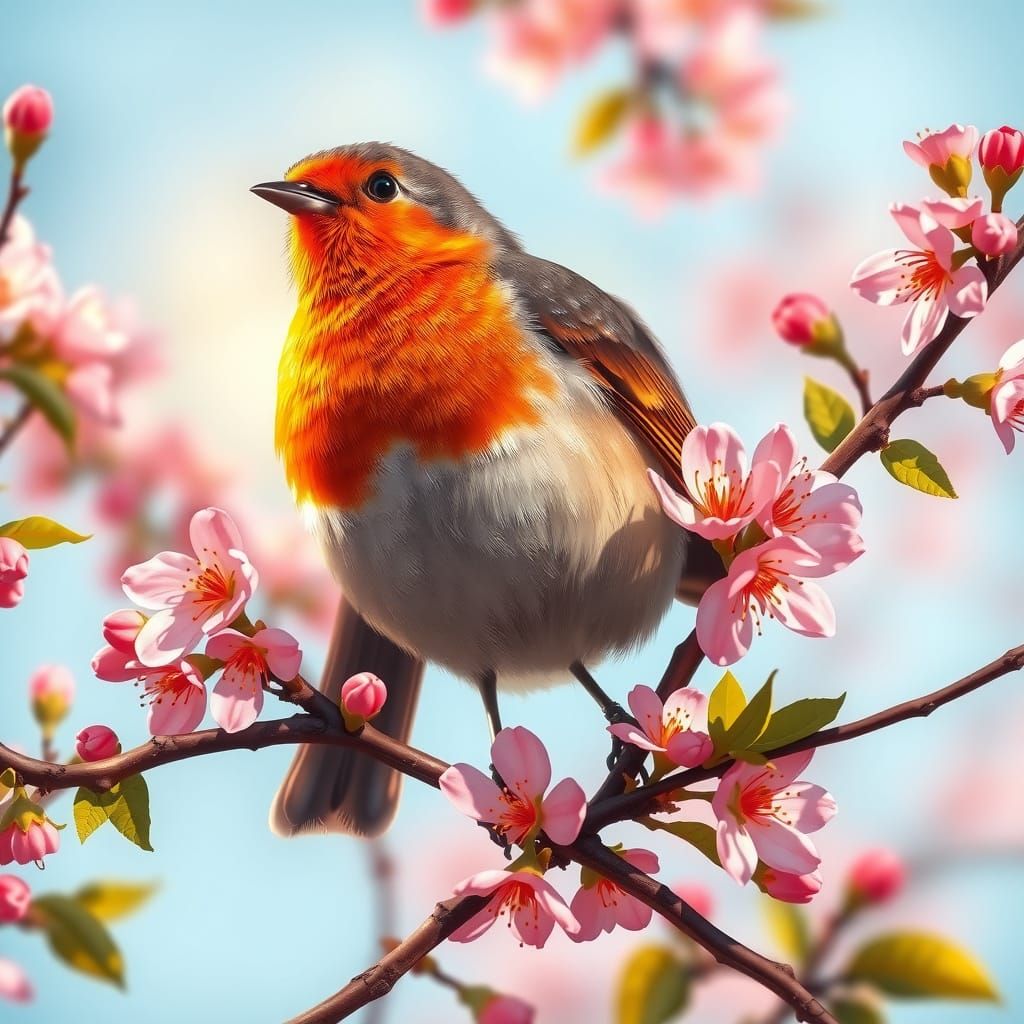 A striking picture of a robin perched on a flowering branch, its chest puffed out in pride. The bird's feathers display rich red and brown hues in the warm morning light, in a painterly style.