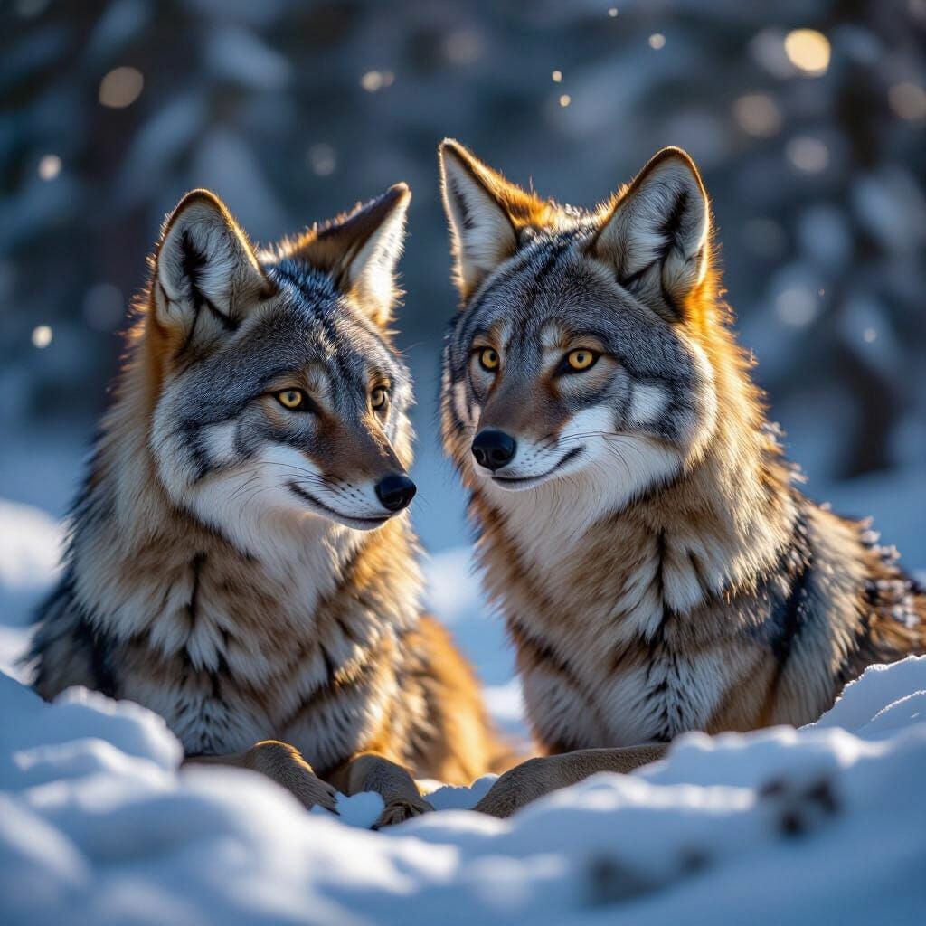 A striking portrait of coyotes in a cinematic style. The image features dramatic lighting, film grain, and a vignette effect, with triadic colors and intricate details. The image is reminiscent of art nouveau.