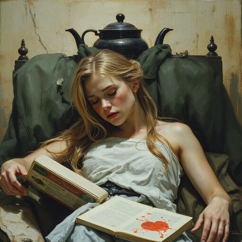 This image shows a blonde teakettle in a state of furious repose. The image has a sinister quality, reminiscent of dark fantasy art.