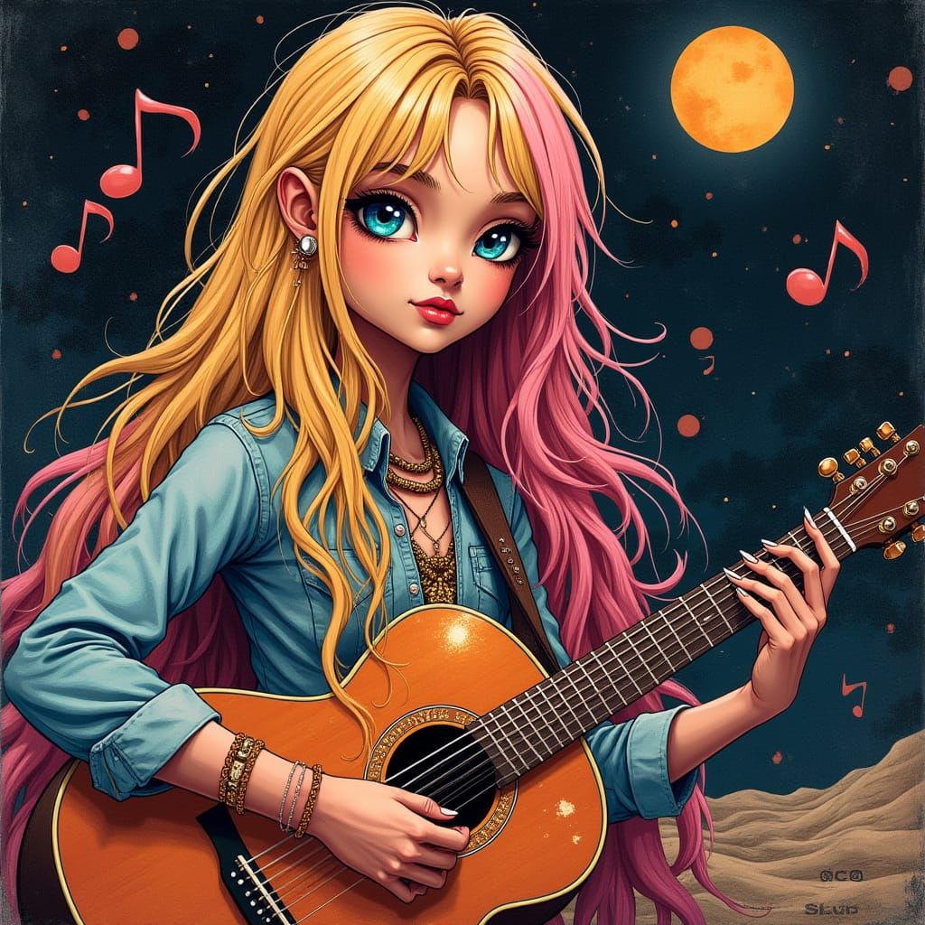 This image features a surreal portrait of a hippie musician girl with blonde and pink hair, playing an acoustic guitar. Created in a vibrant graffiti art style with melting oil gouache and acrylic textures, it is highly detailed and polychromatic.