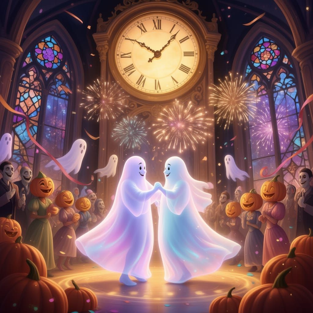 A charming image of a sweet ghost couple dancing gracefully amidst smiling phantoms and pumpkin guests, bathed in golden light and pastel colors, evoking a Disney romance.