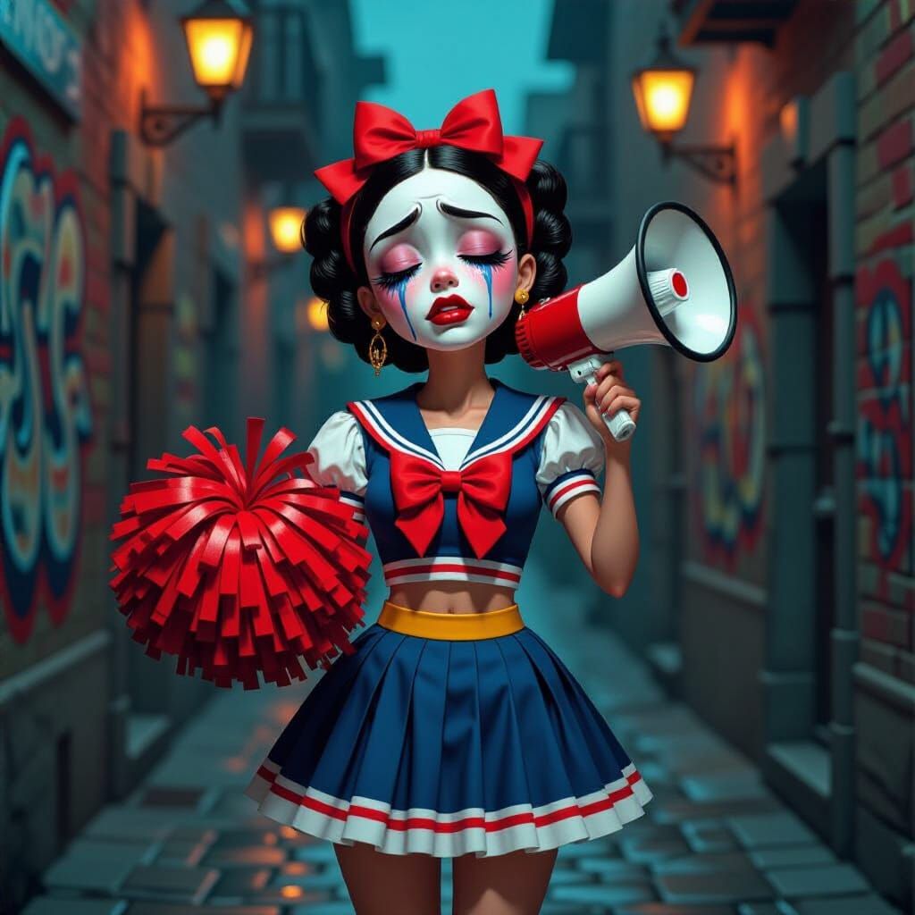 This image shows La Llorona in a cheerleader outfit, crying in an alley. The picture blends Gothic and Mexican folk art elements, similar to surrealist and folk art.