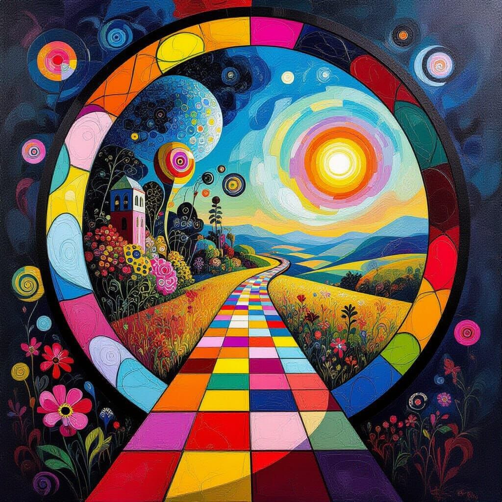 This image shows a vibrant, surrealist oil painting of a journey through a colorful wire tube, inspired by Salvador DalΓ's dreamlike style. Intense colors and bizarre objects evoke profound curiosity and wonder.