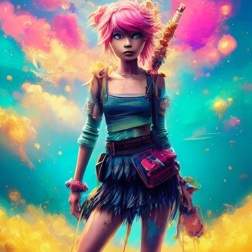 This concept art illustration features a young woman with pink hair, freckles, and black-painted nails. She holds a camera, dressed in vibrant yellow attire, captured in dynamic pose with golden hour lighting.