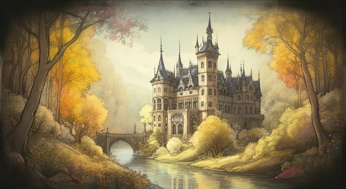 This image features a grand castle with intricate details, set against a rough-hewn blackboard background, surrounded by a warm pastel forest and a serene pastel blue river, evoking a dreamy, vintage charm