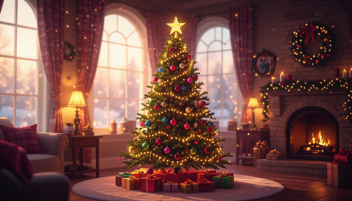 This image showcases a beautifully decorated Christmas tree with lights and ornaments, radiating warmth in a dimly lit room. Rendered in a painterly digital art style with dramatic lighting.