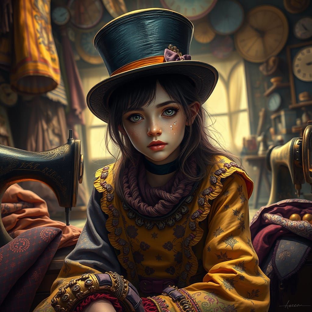 A digital painting of a girl in a steampunk-inspired sewing workshop surrounded by textiles. The portrait features dramatic lighting, a warm color palette, and intricate details in an 8k resolution.