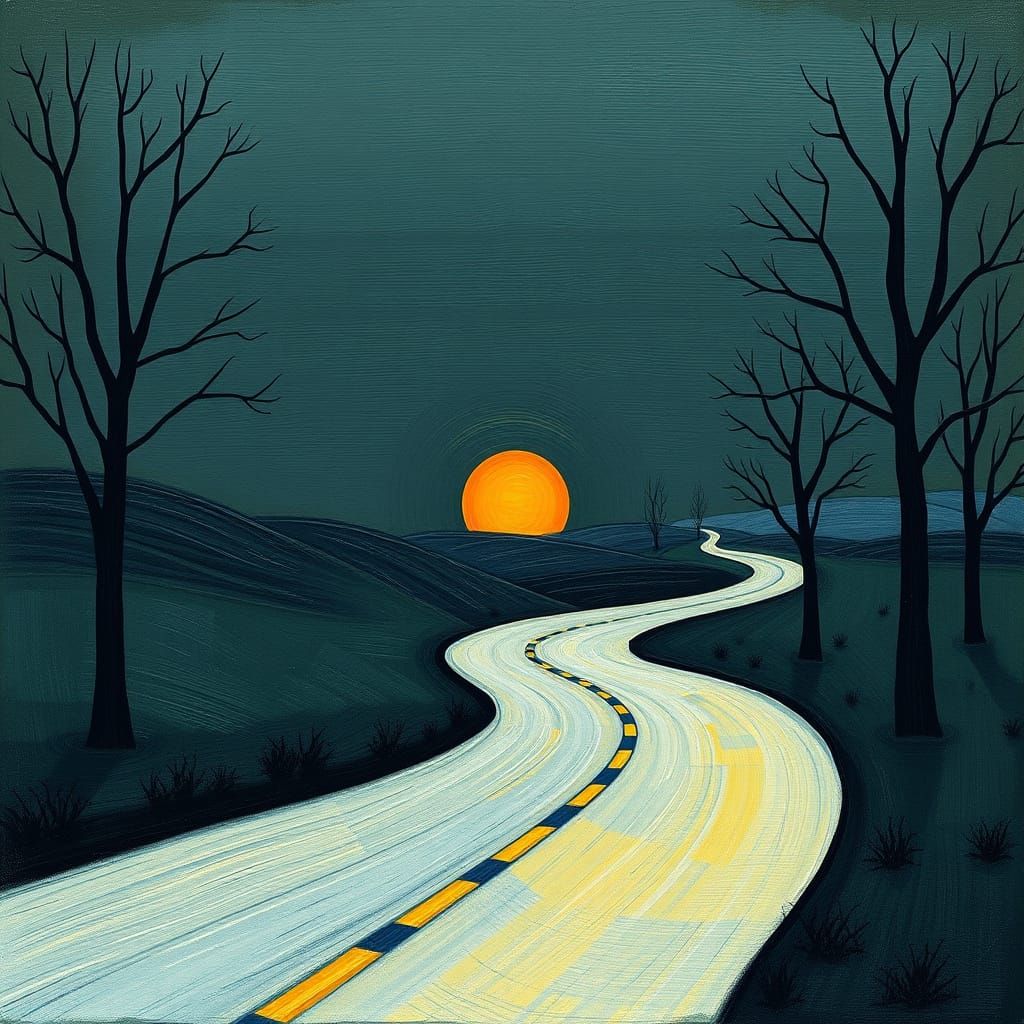 This image depicts a desolate winding road under a dark, setting sun, casting a dim light. The scene features cold color tones, evoking a sense of journey.