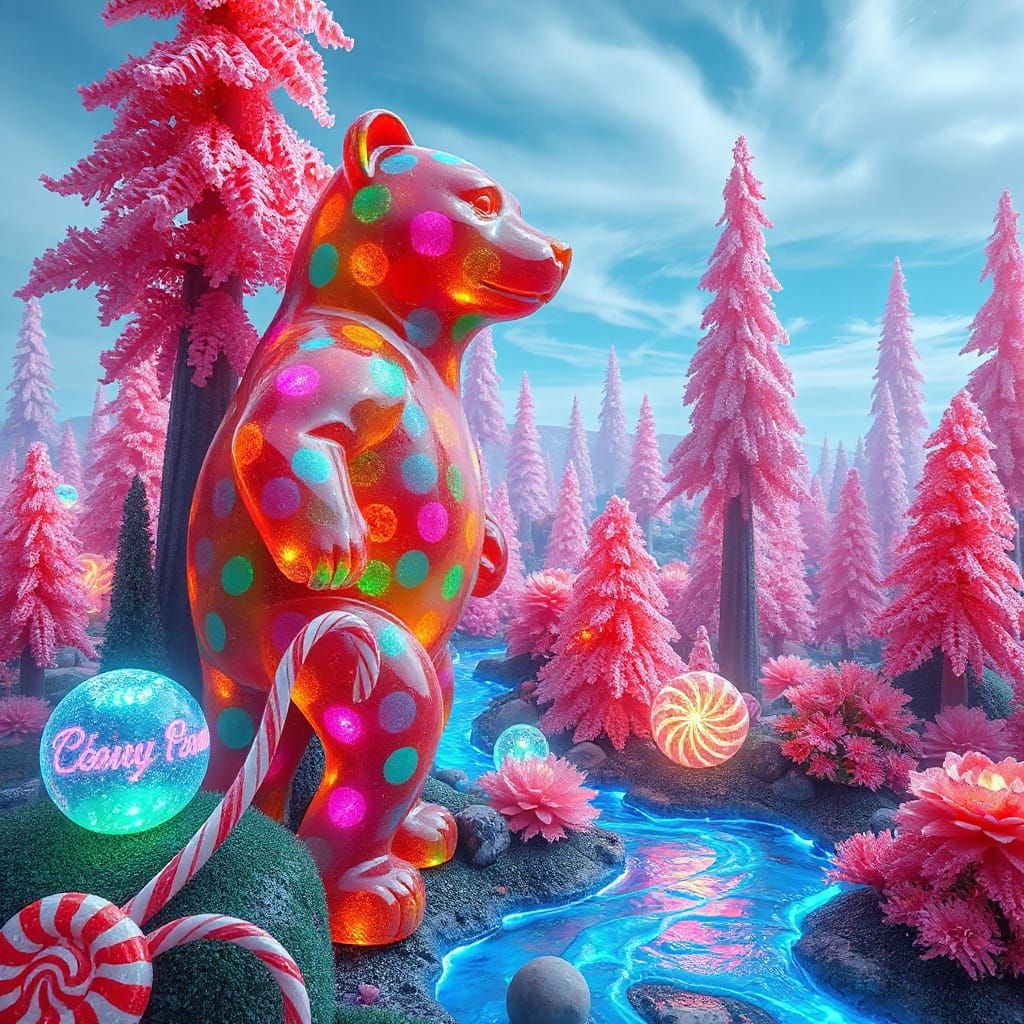 A colossal, translucent gummy bear guards a magical forest of lollipop trees and candy rivers. The scene features ethereal lighting and vibrant colors, blending art nouveau and surrealism.