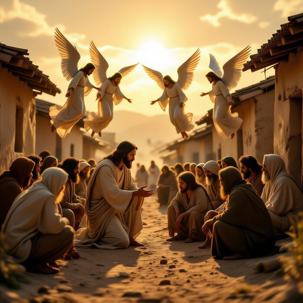 This photorealistic image shows celestial angels descending upon a humble village, with Jesus compassionately aiding its poor inhabitants. Bathed in warm golden hour light, it captures a miraculous interaction with cinematic detail.