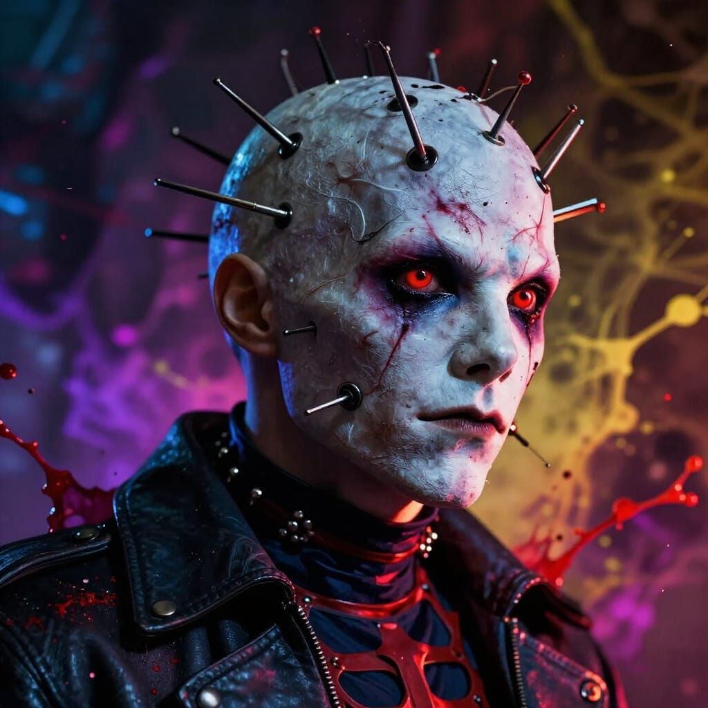 This hyperrealistic concept art captures Pinhead from Hellraiser in a dramatic mid-shot. Featuring intricate detail, vibrant color, and sharp lighting for visceral horror and cosmic dread.