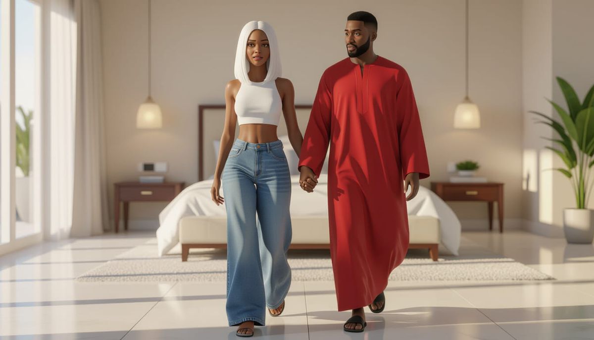 This image shows a hyperrealistic animated scene of an African woman crying as a man carries her into a luxury bedroom. Features intricate 3D shading and dramatic lighting.