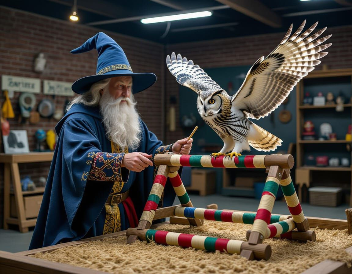 "Happy old wizard with fierce eyes. Athletic wizard training an owl on an obstacle course, ultra detailed. detailed showroom background. magical details."