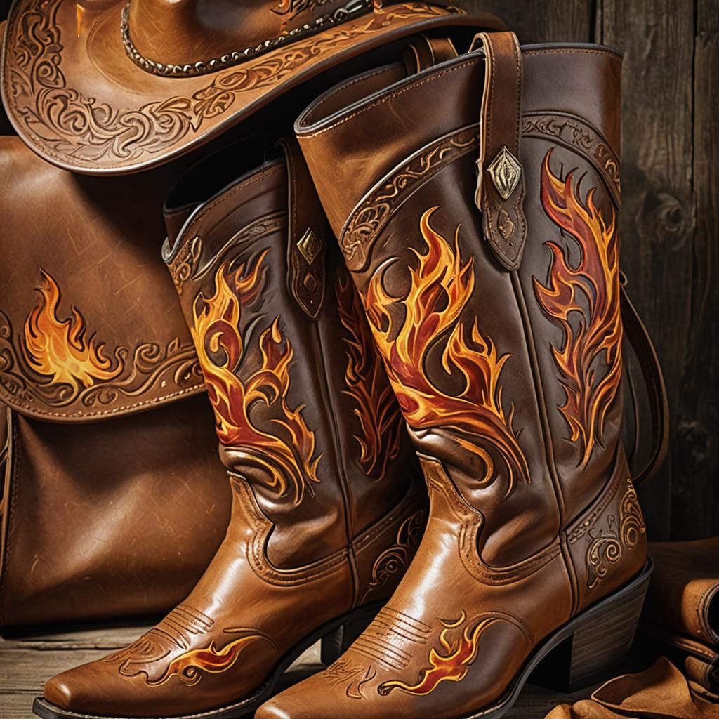 This image depicts a purse and cowboy boots adorned with a flame design. The photorealistic rendering captures the intricate details of the leather and the vibrant flames.