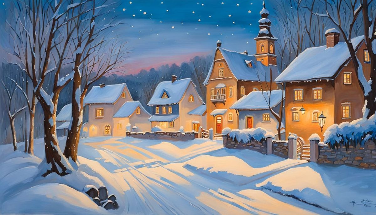 This gouache painting showcases a charming village blanketed in fresh snow under a twilight sky. Warm window lights create a cozy, nostalgic ambiance with delicate textures and soft focus.
