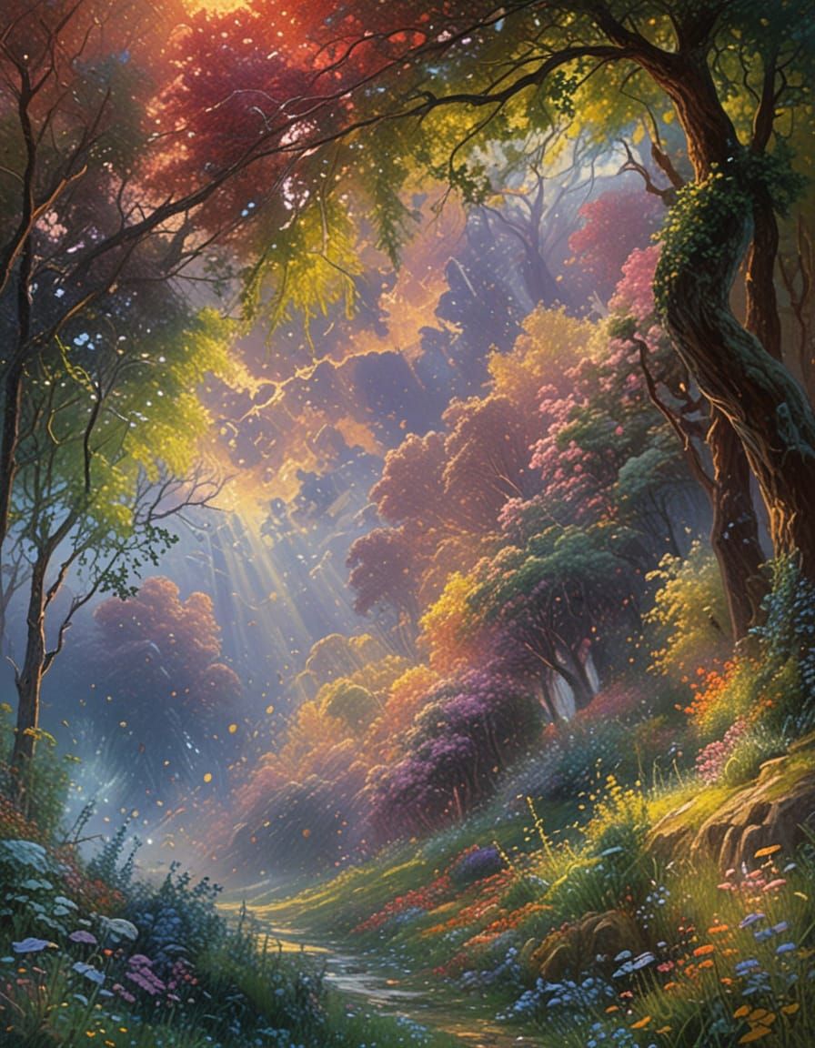 A dynamic oil painting depicts a chaotic scene of colors blending together. This medium shot features thick impasto texture and vibrant brushstrokes in an expressionist style, illuminated by soft heavenly light.