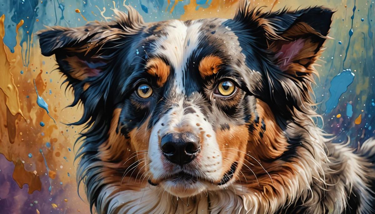 A hyperrealistic image of a tri-colored, bob-tailed Australian Shepherd with two blue eyes. The splash art style features intricate details, a colorful background, and dramatic side lighting.