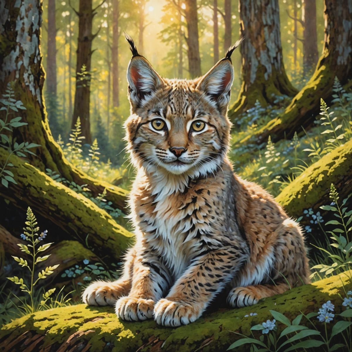 A peaceful lynx kitten rests in a forest clearing, surrounded by wildflowers and ancient trees. Rendered in a soft, ethereal watercolor style with gentle brushstrokes and warm golden light.