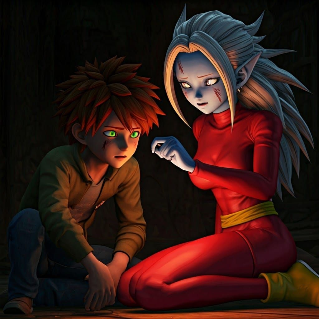 A haunting scene of Towa from the Dragon Ball Xenoverse 2 universe, her blue skin and white hair illuminated by flickering flames, as a malevolent presence whispers sinister thoughts into Alex's mind, radiating an aura of pure rage and malice.