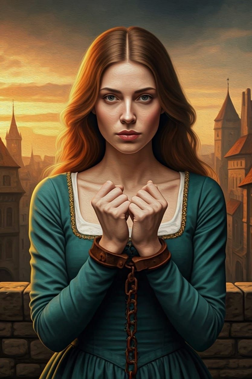 A fine art portrait of a medieval woman in handcuffs, set in a medieval city at sunset. The oil painting features warm hues and realistic colors, reminiscent of Bosch, Cecile, Mann and Strzeminski.