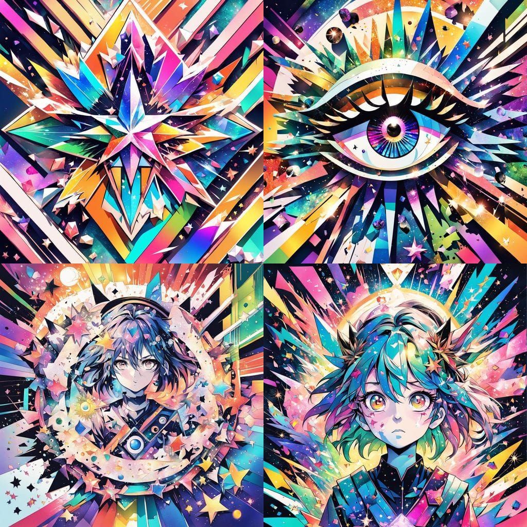 This detailed textured paper collage art features anime elements like eyes and chibi figures, with crystal shards refracting rainbow light in a chaotic yet harmonious mixed-media arrangement.