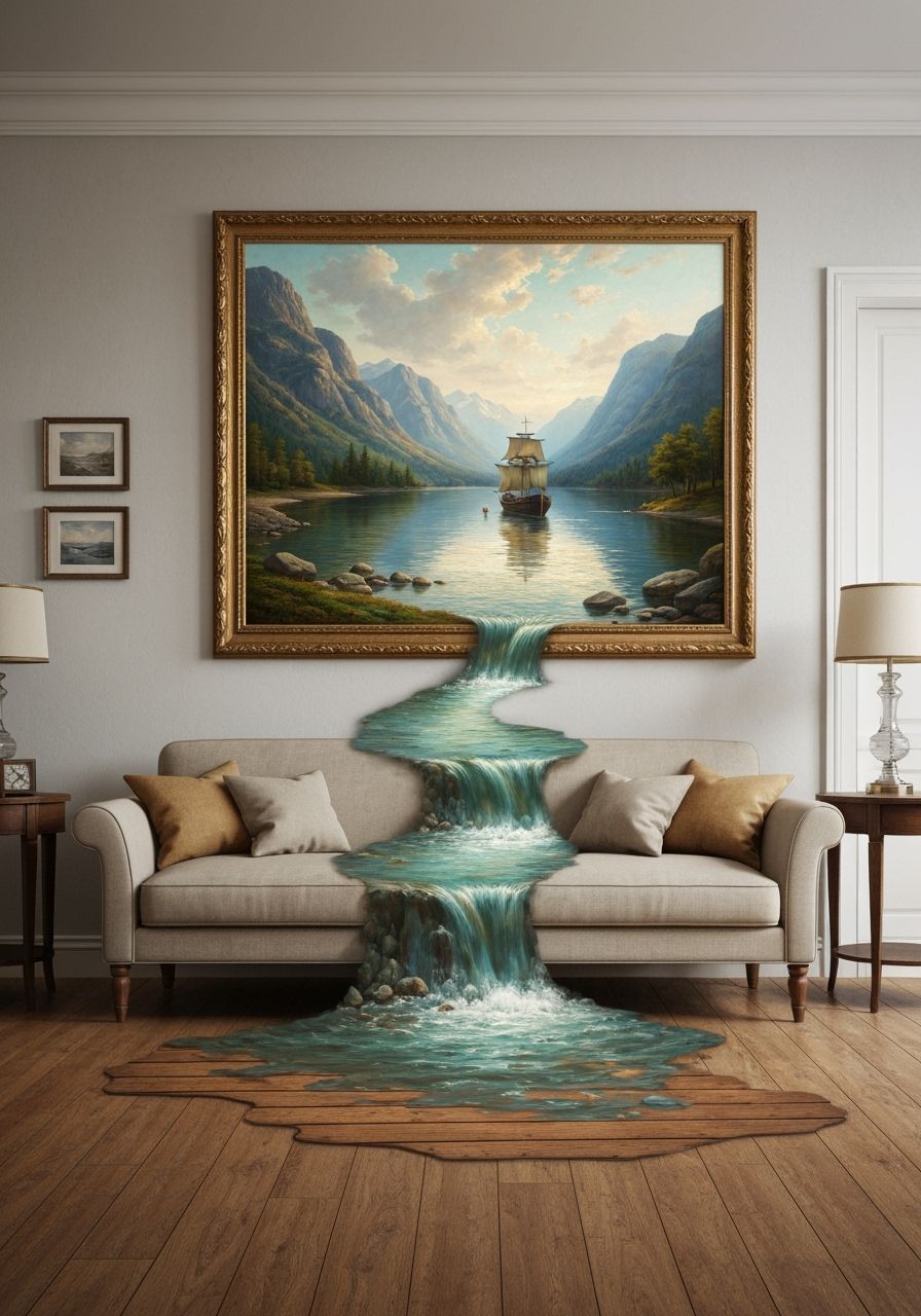 This image shows a river flowing from an oil painting into a living room. The artwork blends reality and art with a tranquil river scene contrasting with the room's warm tones.