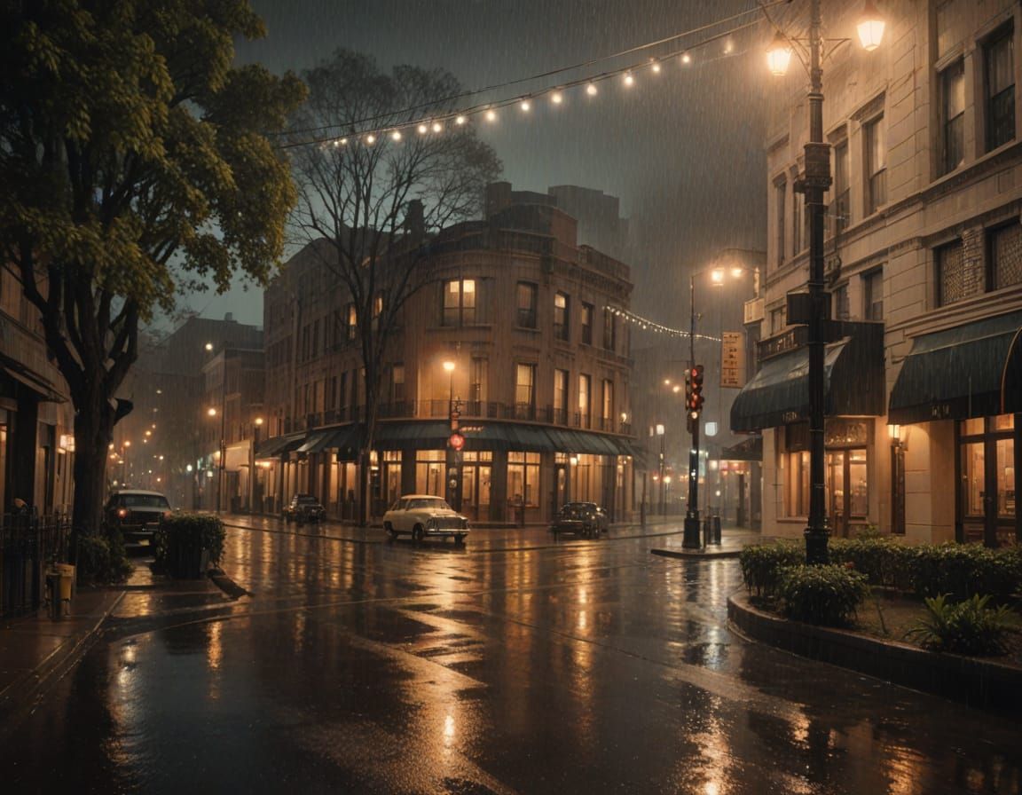 A cinematic image of rainy city streets at night, reflecting vintage tones. The long shot captures a nostalgic atmosphere with luxurious art deco details, reminiscent of old Hollywood.
