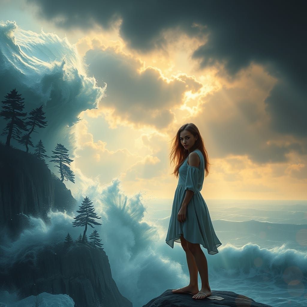 This image shows a woman on a cliff edge with dramatic late afternoon light breaking through storm clouds. Hyperrealistic style with sharp contrasts and colorful bokeh effects.