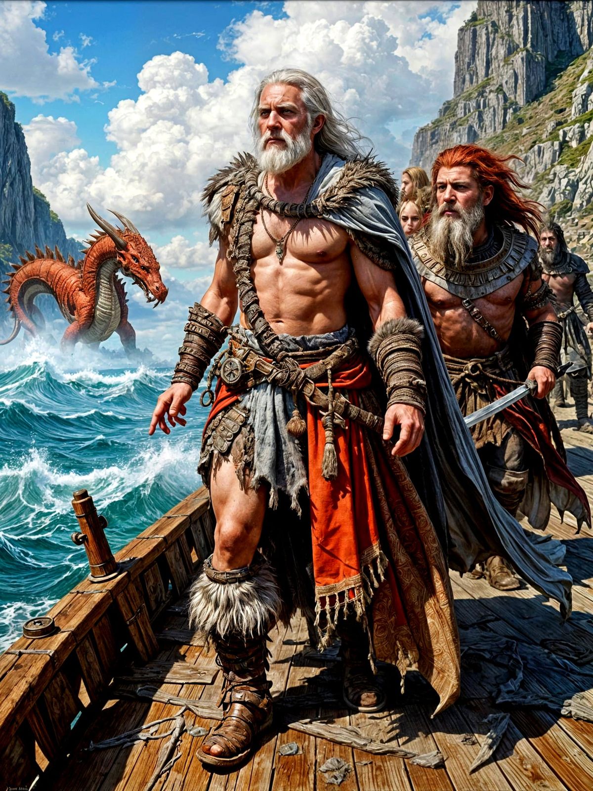 This oil painting depicts a pale, white-haired barbarian leading giants on a longboat towards a dragon battle, guided by an ancient sky map.