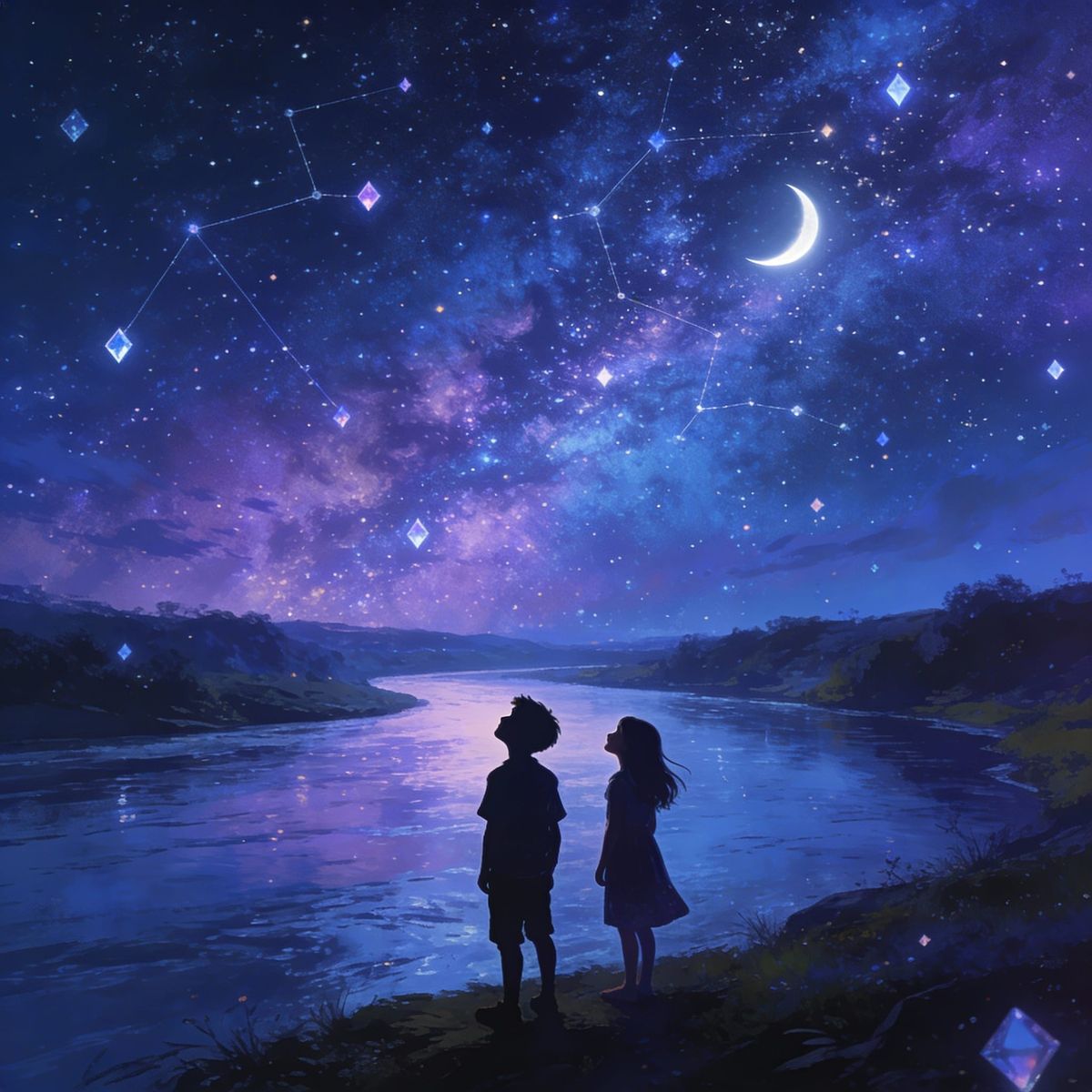 This digital matte painting shows a boy and girl silhouetted against a vast, star-filled night sky and a sliver of moon. Deep blues and purples evoke awe and infinite possibility.