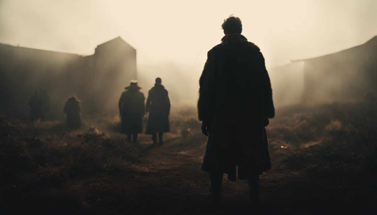 A close-up portrait of a mysterious figure beckons in the shadows, exuding an otherworldly intensity with gleaming eyes. Shot in a moody, high-contrast 35mm film aesthetic with a dark, muted color palette and flashes of eerie light.