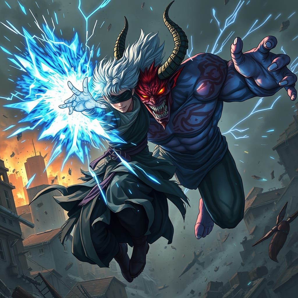 This image shows a white-haired sorcerer battling a muscular demon amidst a ruined cityscape. The scene is rendered in a detailed anime style, with vibrant energy and cinematic lighting enhancing the explosive clash.