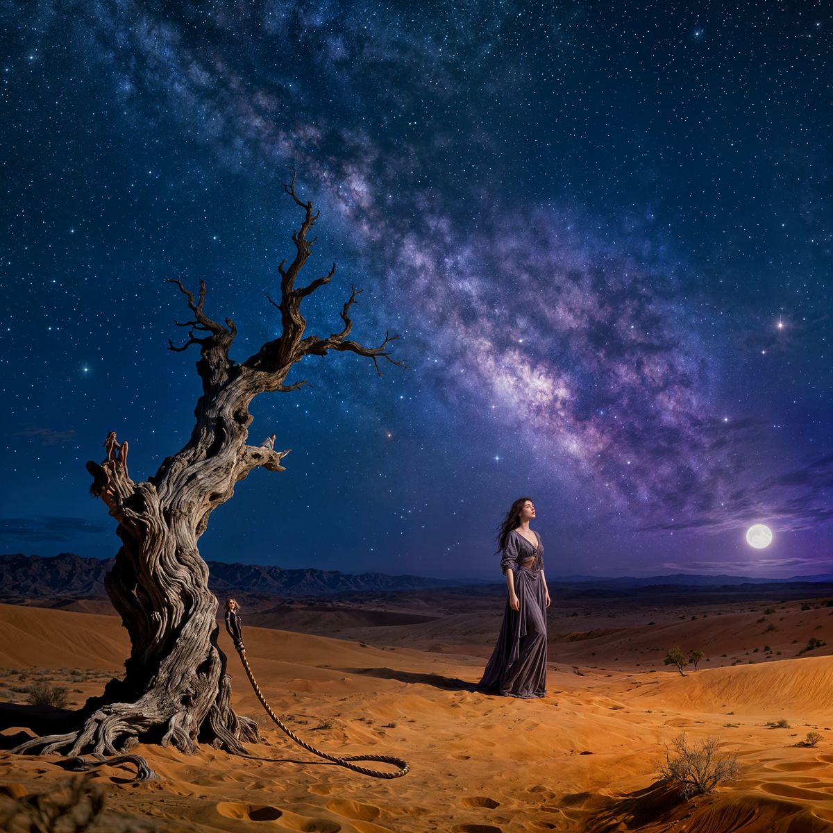 This image captures a surreal desert scene with deep water, an abandoned element, a lone woman holding a whip, and a prominent tree beneath the vast Milky Way.