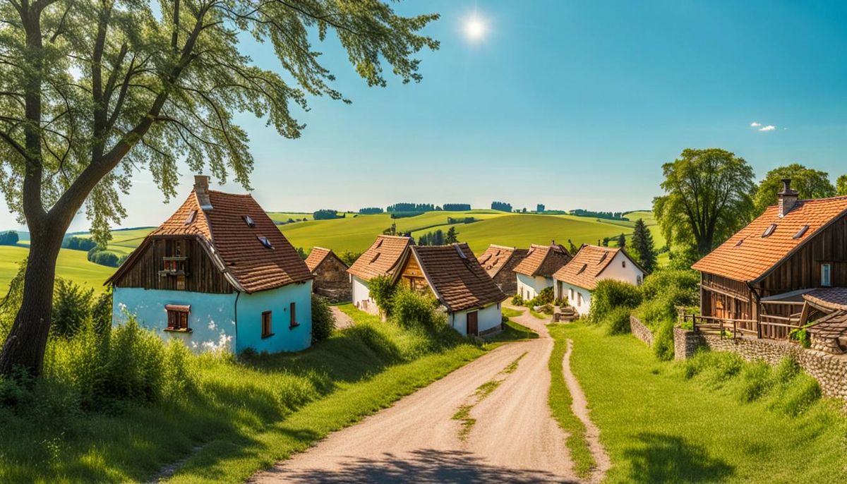 This image depicts a quaint Hungarian village bathed in summer daylight under a clear blue sky. The scene is rendered with a matte finish and captured in high-resolution 8K detail.