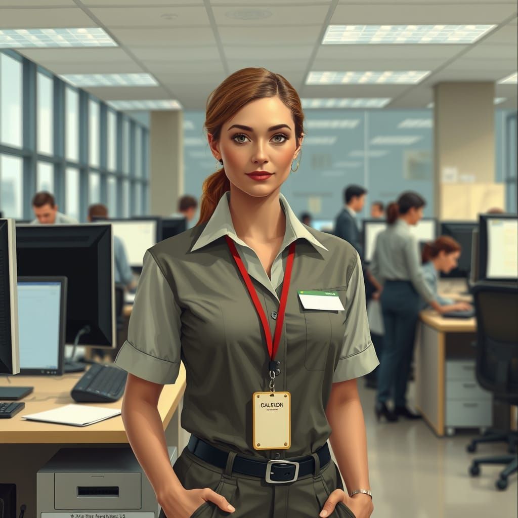 A realistic image of a woman wearing a work uniform and ID badge inside a busy office. The style is reminiscent of photorealistic fine art, depicting ordinary contemporary life.