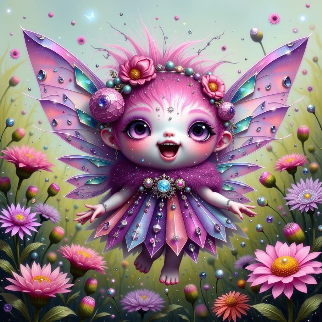 This enchanting image depicts a fantastical, crystalized fae creature with a fluffy, rounded body and glistening opalescent wings, set against a backdrop of lush, colorful zinnia flowers and a beautifully patterned Gingham cloak. The artwork combines elements of fairy punk and whimsical fantasy with deli...