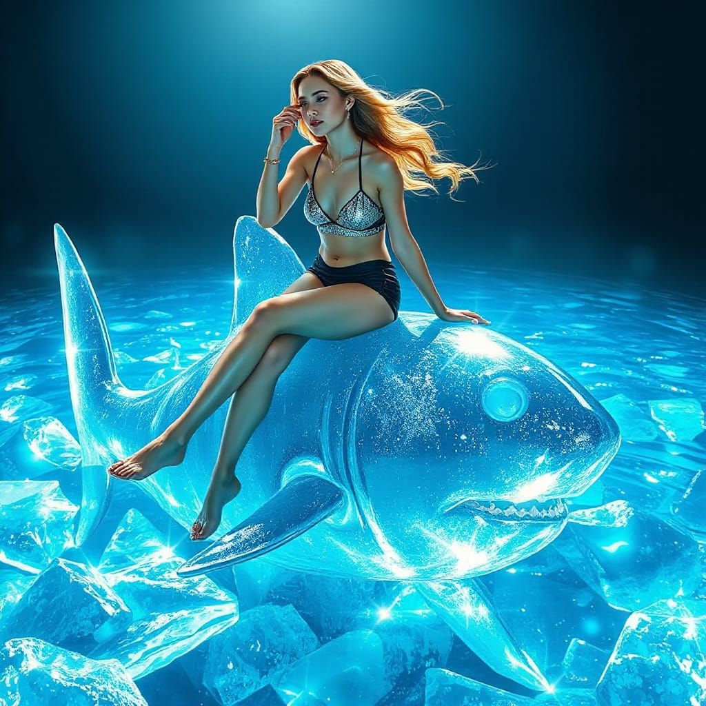 A serene woman with golden hair sits on a giant blue sugar shark floating in glowing soda. Whimsical fantasy art with art nouveau elegance and neon accents.