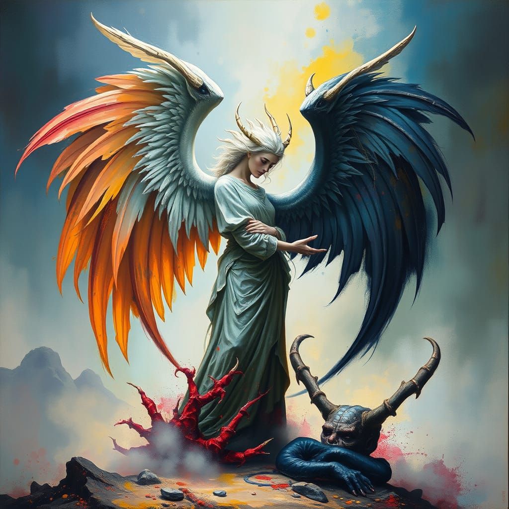 This image shows an angel and demon intertwined in a dreamscape. The artwork blends bold brushstrokes, vivid colors, and swirling mist in an expressive, surreal style.