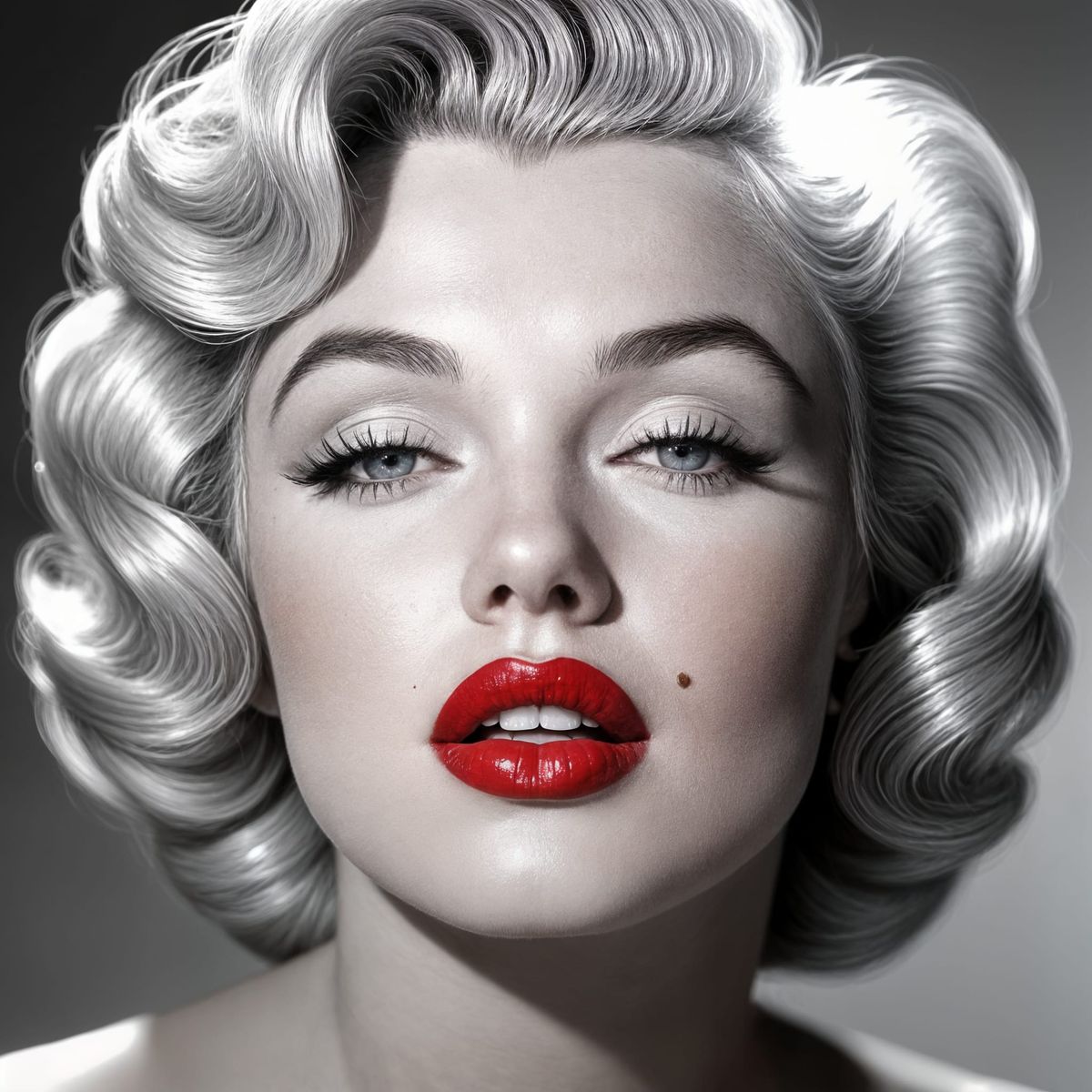 This striking image features a detailed close-up portrait of Marilyn Monroe, capturing her iconic bright eyes and pouting lips in a pin-up style with soft ambient lighting.