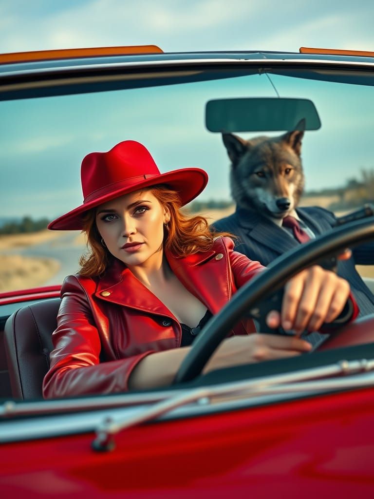 A vivid image of a redhead woman in a red leather jacket and fedora driving a cherry red 1964 Chevrolet Chevelle Malibu. A wolf-headed man in a pinstripe suit sits beside her.