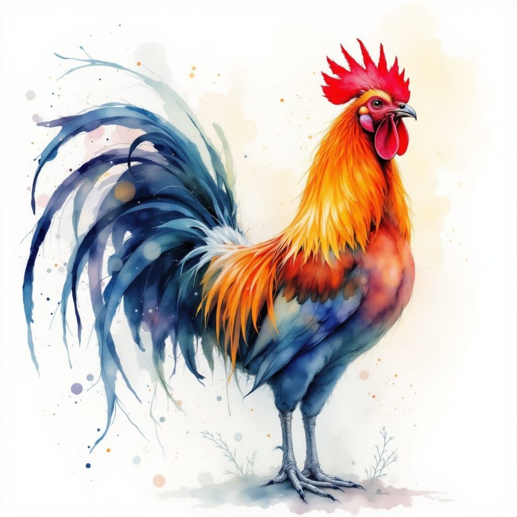 This image showcases a luminous watercolor painting of a rooster, its vibrant colors sharply contrasting with a muted background.