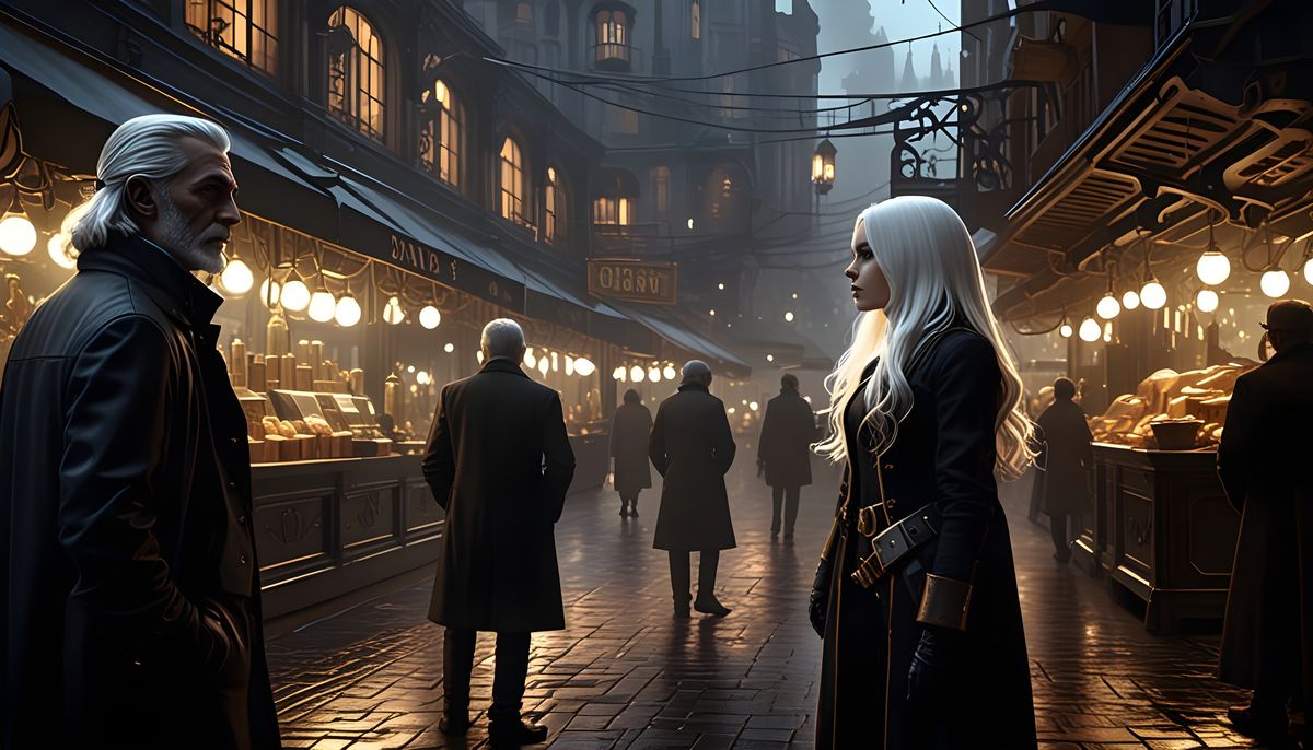 This image depicts a striking scene of a woman with long silver hair and a man in a dark coat standing in a bustling marketplace. The artwork combines elements of steampunk fantasy with a cinematic, photorealistic style, featuring soft brass reflections and warm bronze lighting.
