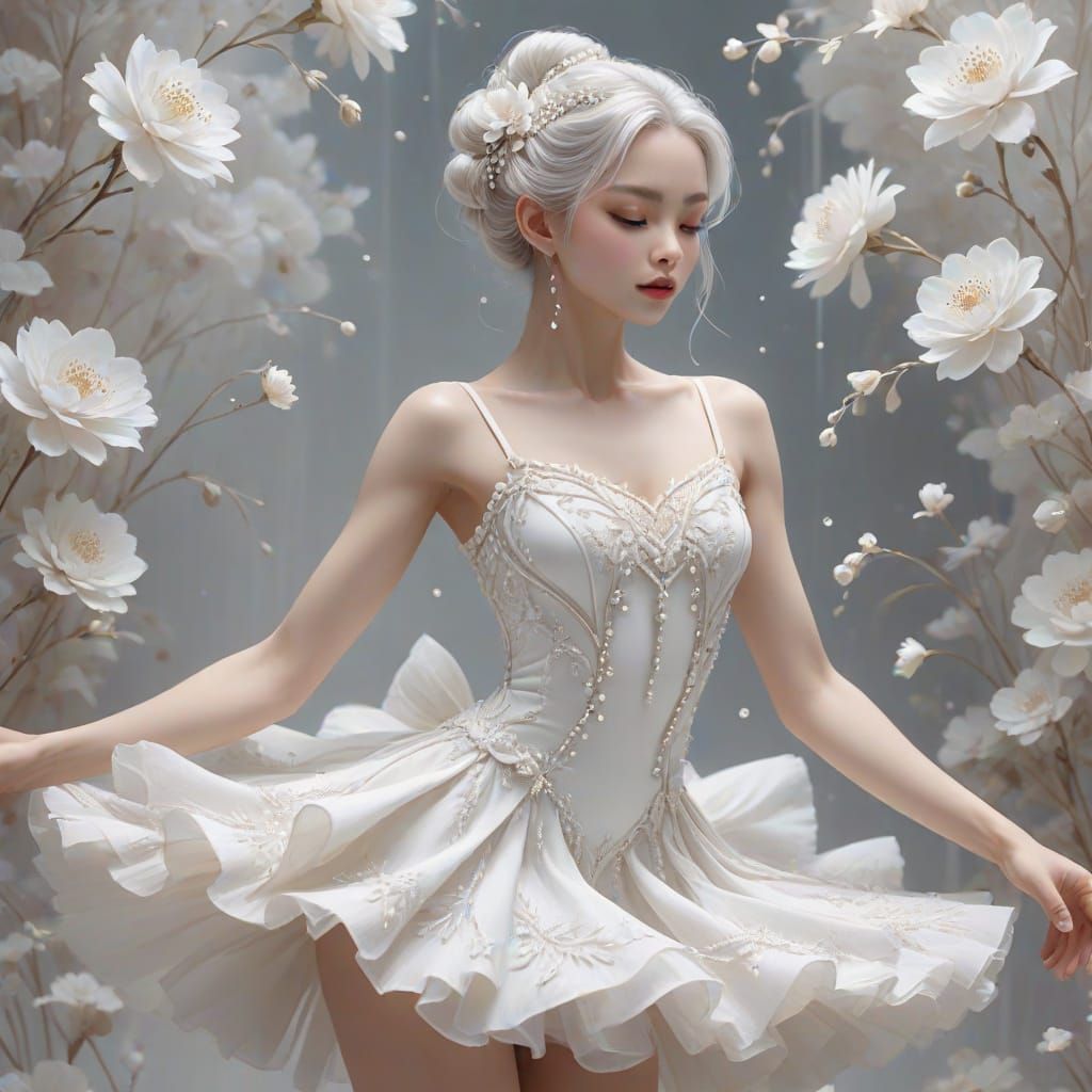 This image shows a beautiful, ethereal ballerina in a dynamic pose. The artwork is in an anime style, rendered with hyper-realistic details and a pure white color palette. The dancer is surrounded by magical, textured elements.